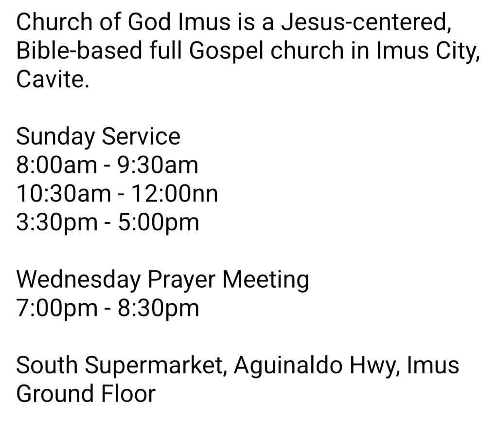Watch the latest messages WATCH ALL MESSAGES ON OUR YOUTUBE CHANNEL We are a church after god's own heart aspiring to transformImus and its neighboring communities into a born-again city Through the power of the holy spirit. HAVE YOU ACCEPTED THE GIFT OF SALVATION? Accept the best gift of your life! Bridge Illustration (English) Mahal ka ng Diyos (Tagalog) We are Social! Watch Live Worship Service on Facebook See our latest posts and be blessed!. Download our App